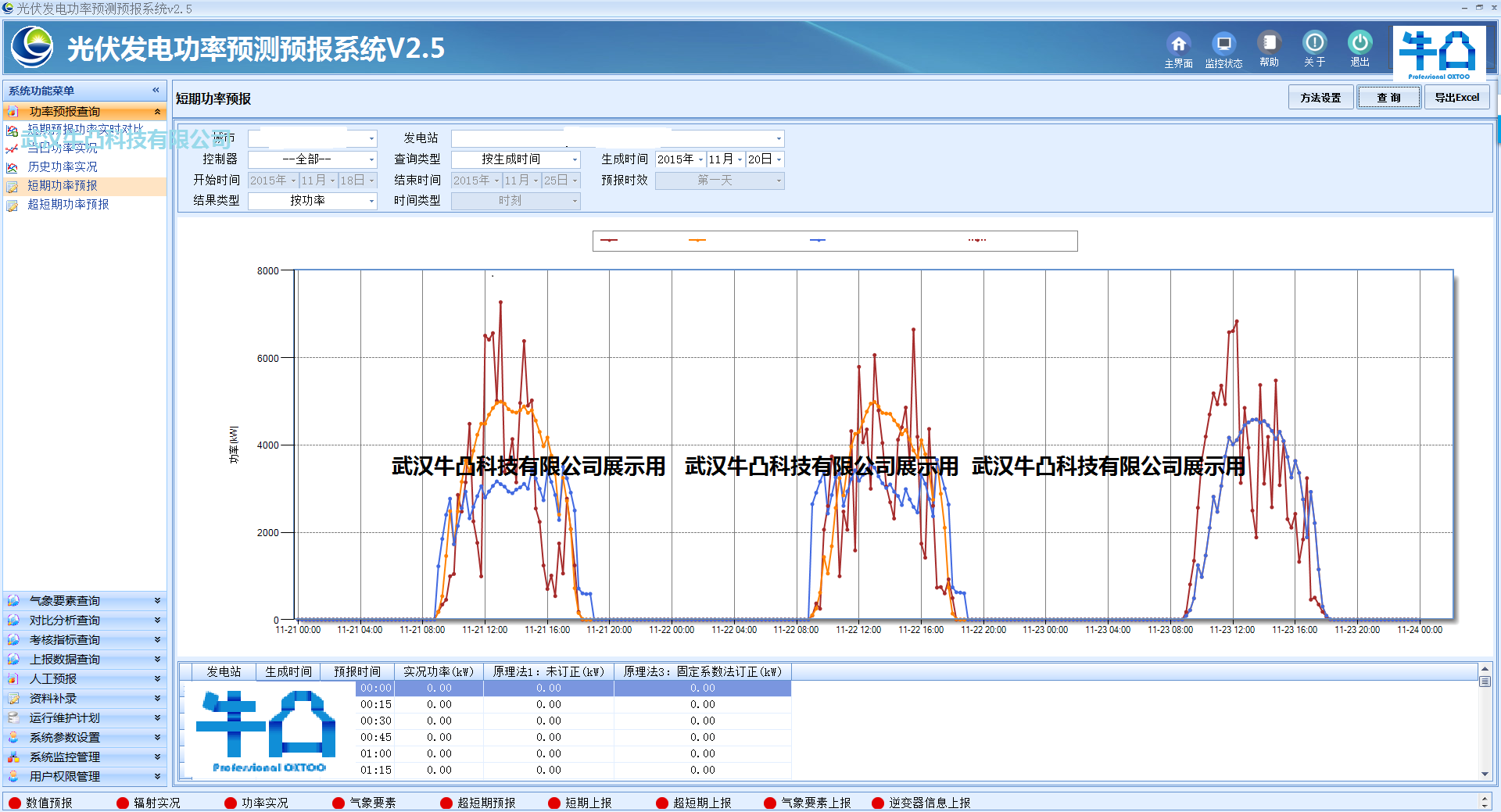 系統由兩大部分組成:第一是管理查詢系統,包含預報方法設置、系數設置、運行維護計劃、實況預報對比和誤差率分析等管理查詢功能;第二是通訊系統,包含自動超短期預報、短期預報、實況功率、自動氣象站輻射、數值預報產品獲取和調度上報功能。